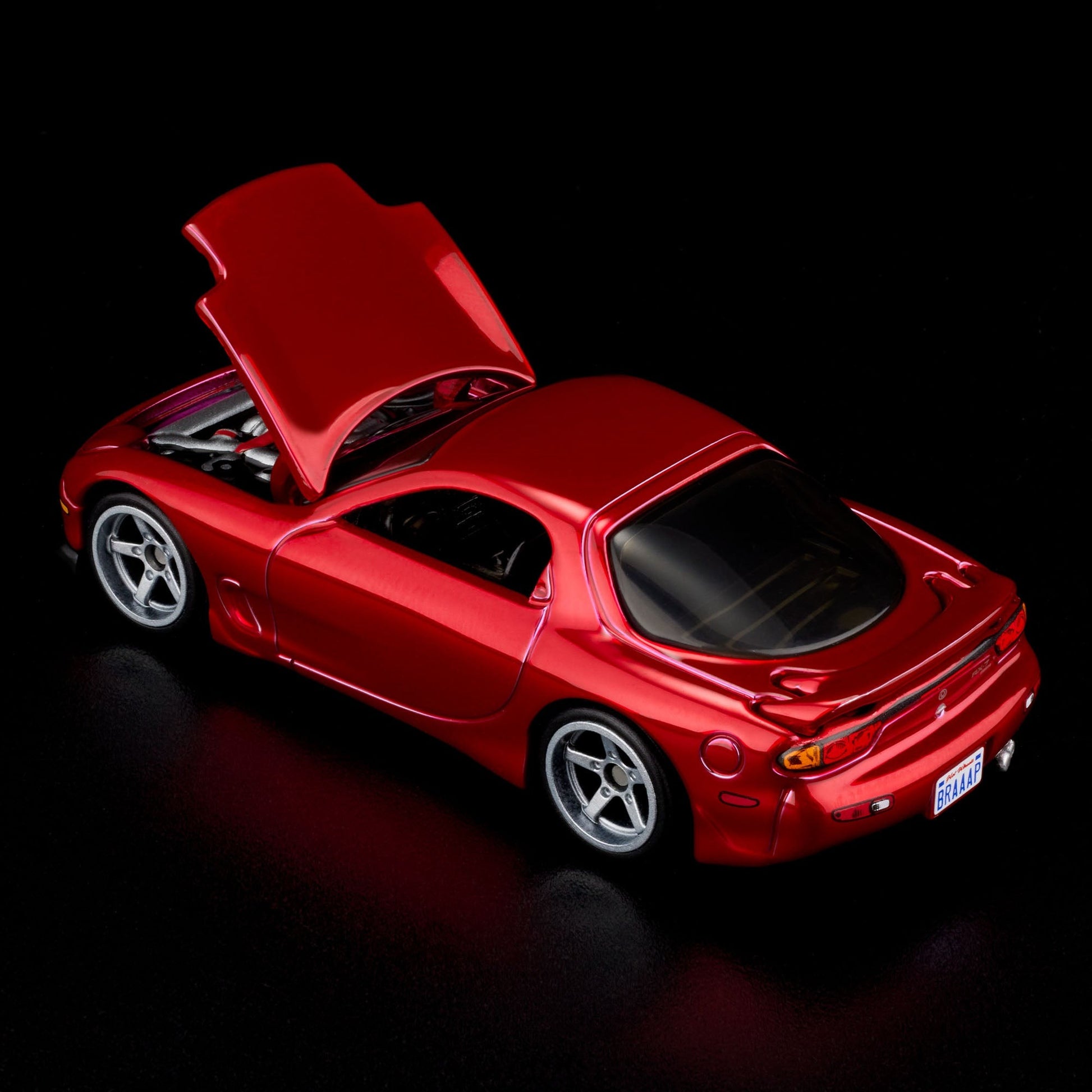 The 1993 Mazda RX-7 R1 delivered race-inspired performance to an audience hungry to feel the need for speed. Lightweight and powered with a two-chamber turbocharger which activated sequentially to reduce lag time, this fiery red roadster turned roads into racetracks for drivers fortunate enough to get behind its wheel. Our RLC exclusive version brings its own showstopping appeal with bright red Spectraflame paint over a silver chrome body, a black matte chassis, and Real Riders 5-spoke modern wheels.